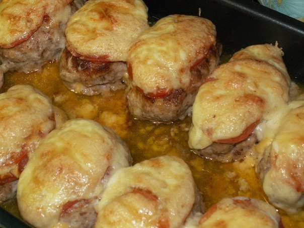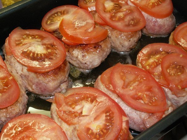 Помидоры порезать тоненькими ломтиками, выложить сверху на котлеты.