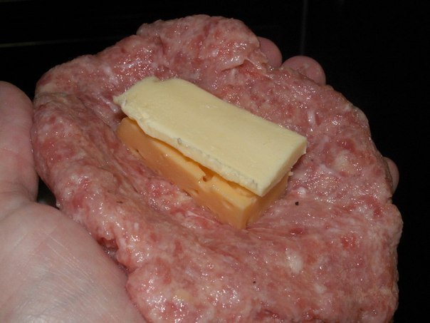 Мокрыми руками сформировать шарик из фарша, размять его, придав форму круга. В центр положить сыр, а на сыр — масло. Края защипнуть.
