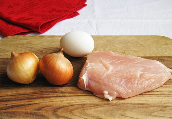 К измельченным филе и луку добавить яйцо. Отдельно замечу — яиц не нужно больше, чем одно! От этого только появится никому не нужная жесткость в котлетах. Скажу по секрету, конкретно эти котлеты я готовила вообще без яиц.