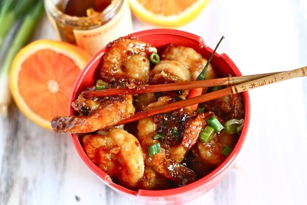 Смешайте апельсиновый джем и сок одного апельсина. Порежьте перец чили колечками, вычистив хорошо зерна. Затем замаринуйте креветки в этом маринаде на 15-20 минут.