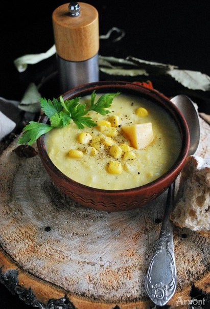 Пюрировать суп блендером (несколько зёрен кукурузы сохранить для подачи) и вернуть на огонь на пару минут. Посолить по вкусу.