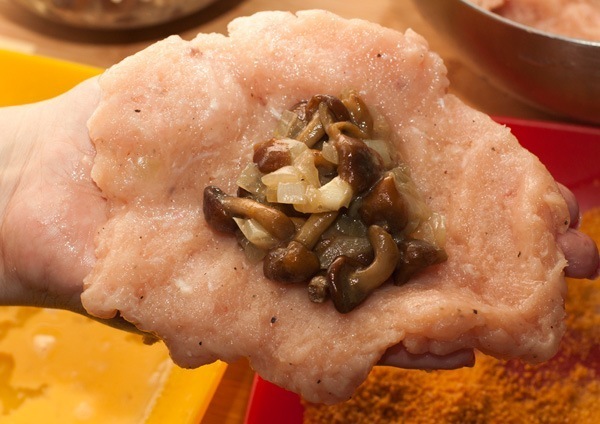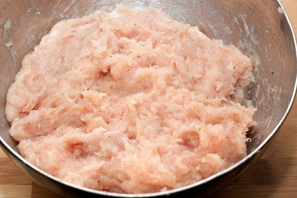 Куриные грудки нарежьте небольшими кусочками и измельчите в блендере или мясорубке.В полученный фарш добавьте яйцо, соль и перец.