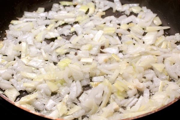Лук мелко нарежьте и обжарьте в масле до прозрачности.