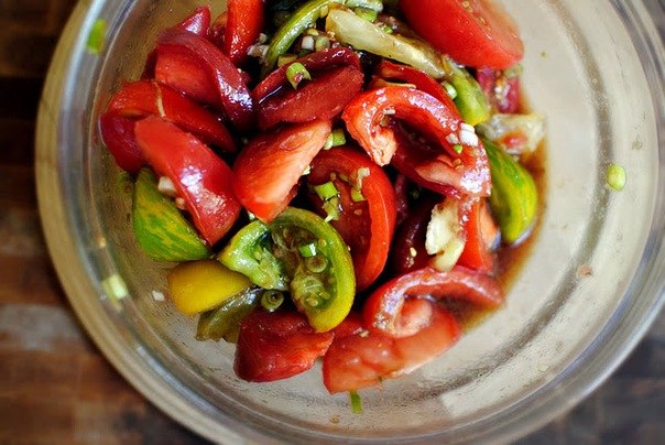 Вылейте полученную смесь на помидоры и хорошенько перемешайте
