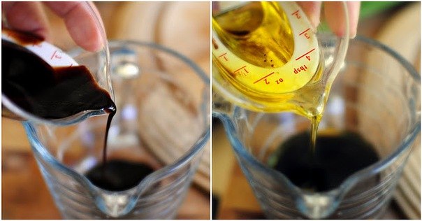 Нарезанный лук и чеснок выложите в отдельную мисочку и перемешайте. Добавьте к уксусу и маслу, тщательно перемешайте.