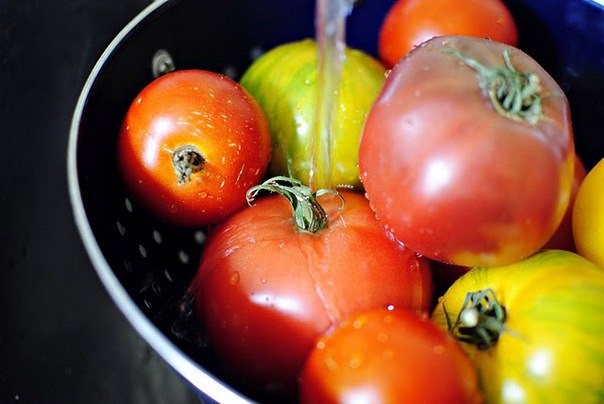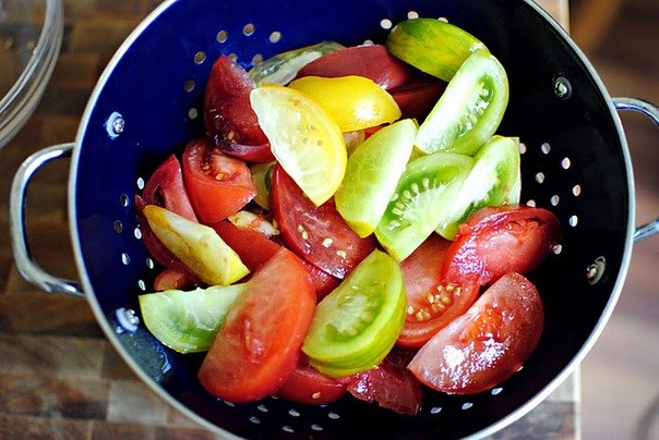 Разрежьте каждый помидор на 4 кусочка, затем каждый кусочек еще пополам. Выложите нарезанные помидоры в дуршлаг. Поставьте его на кастрюлю. Посыпьте помидоры солью и оставьте на 20 минут.