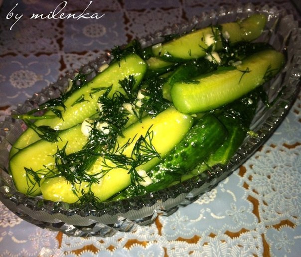 Измельчить ческок, нарезать укроп и добавить к огурцам. Хорошо перемешать и оставить на 3 — 4 часа.