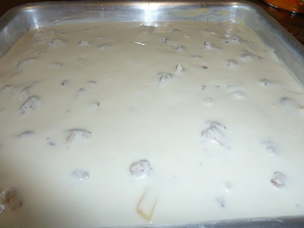 Заливаем тестом (3 яйца, соль,0.5 молока, 0.5 кефира и немного соды в нём (в кефире) гашеной, муки примерно 3 стакана-тесто должно получится как на блины).