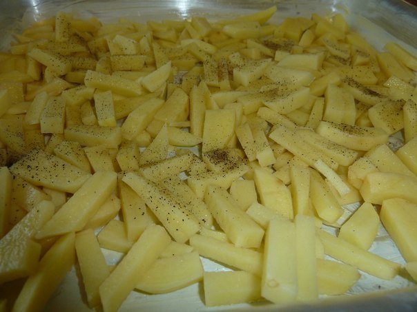 На смазаный противень укладываем нашинкованый картофель (8 средних), солим, перчим.