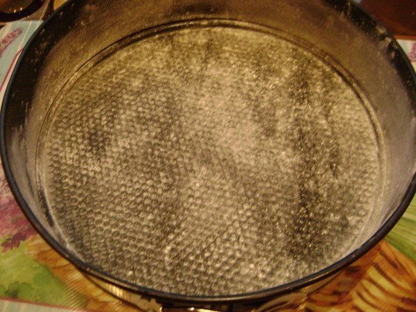Выключаем и отставляем в сторону миксер. В смесь добавить разрыхлитель, манную крупу , муку и осторожно, тупой стороной ложки, всё перемешать от краев к середине. Выложить в заранее подготовленную форму (или сковороду) диаметром 28-34 см с высокими не менее 5см бортиками (смазать маслом и припудрить по всей поверхности мукой).