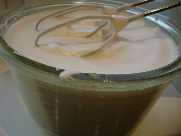 Взбить белки в крепкую пену. Продолжая взбивать, понемногу добавлять сахар.