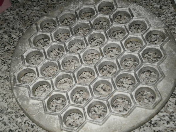 Далее нужно взять пельменницу, посыпьать ее мукой и прокатать пласт теста — получились пятиугольнички из теста.