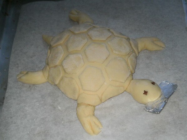 Глазки у черепашки — гвоздички, а чтобы было видно после выпечки рот — сделайте разрез и вложите в него сложенную в несколько раз фольгу.
