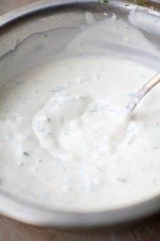 2. Чеснок продавливаем через пресс, зелень мелко нарезаем и смешиваем со сметаной.
