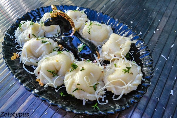 Филе рыбы я порубил ножом. Мясорубка меня тут не устроит, ибо я хочу чувствовать кусочки рыбы, что бы всё было по настоящему)). Лук шинкуем и обжариваем на сливочном масле. Даём лук остыть и смешиваем с рыбной массой, добавляем сливочный сыр, специи, перемешиваем тщательно. Тесто я сделал частично заварное, Вы же можете сделать своё любимое. Раскатываем тесто в тонкий пласт, вырезаем кружки, укладываем начинку, защипываем, соединяем края, проходим руками по краю теста оттягивая его, и заплетаем в косичку. Отвариваем минут 5. Морская рыбка очень быстро готовится. При подаче посыпал свежемолотым перцем, зеленью, и своим любимым сыром. Приятного аппетита!