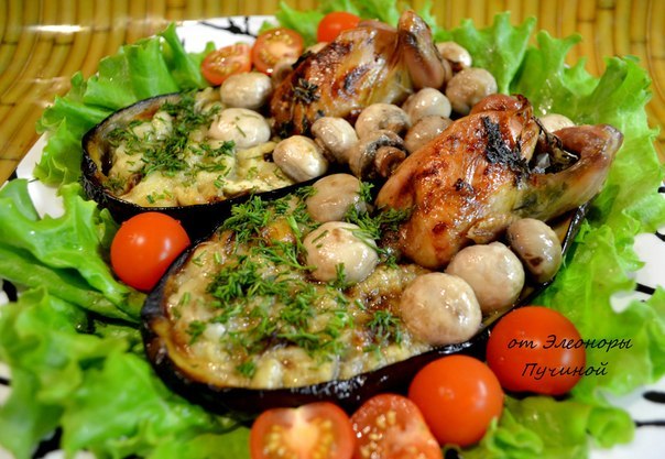 Из готового баклажана делаем лодочку мякоть перемешиваем и сдвигаем на край,добавляем в лодочку перепёлку.Блюдо дополняем зеленью,грибами и помидорчиками.