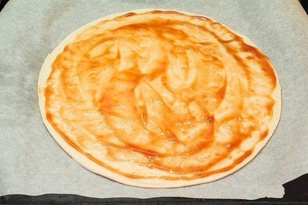 2. Далее необходимо нашу пиццу сдобрить томатным соусом. Когда на дворе лето, я беру спелые помидоры, очищаю их от кожуры и натираю на крупной терке. На сковороде обжариваю пару долек чеснока, добавляю к ним натертый помидор. И на достаточно сильном огне выпариваю влагу. Вот этим и смазываем пиццу. Сейчас на дворе зима, и я использую заготовку (так сказать домашний кетчуп, заготовленный летом.)