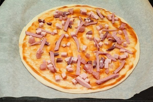 1. Тесто раскатываем до желаемых размеров. Я раскатываю, а потом прикладываю тарелку, на которой будет лежать готовая пицца, и обрезаю ножом для пиццы. В результате получается вот такой ровный край.