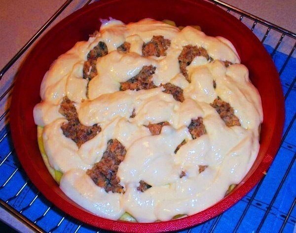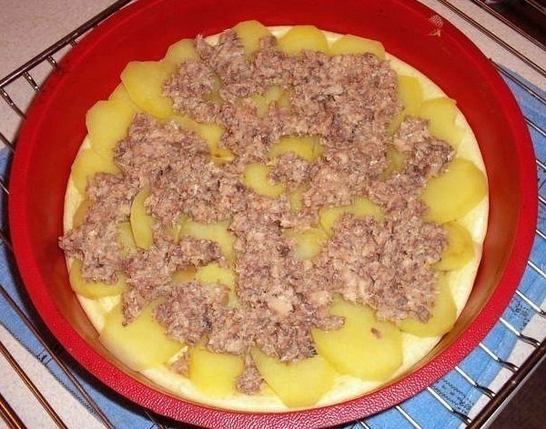 Выкладываем половину теста в форму. Поверх выкладываем картофель или жареные грибы, следующим слоем выкладываем размятые рыбные консервы (1-2 банки, жидкость отцеживаем), или рубленое яйцо с зеленым луком и т.п.