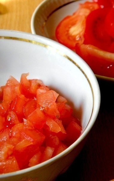 2. Спагетти отварить до готовности в большом количестве подсоленной воды. Оставить на время в дуршлаге, чтоб стекла вода. Тем временем нарезать помидоры. Я половину нарезала кубиками, половину – дольками.