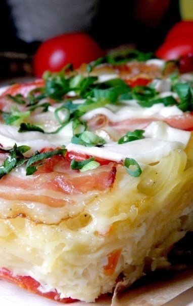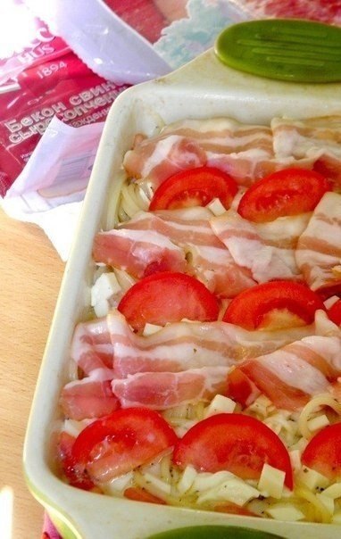 4. Сверху на будущий пирог выложить ломтики бекона и помидоры. Убрать в духовку, нагретую до 180С примерно на 30мин до момента, пока яичная смесь полностью схватится, а бекон станет аппетитно-золотистым.