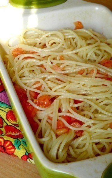3. Форму для запекания смазать растительным маслом. Помидоры, нарезанные кубиками, добавить к спагетти, перемешать. А дальше сделала немного неверно – выложила спагетти в форму и залила яичной смесью, поэтому весь нарезанный сыр остался сверху и мне пришлось все снова перемешивать прямо в форме. Будет лучше, если спагетти добавить в чашку со смесью яиц, молока и сыра и, перемешав, выложить в форму.
