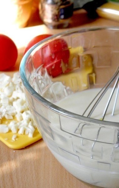 1. Яйца хорошо смешать с молоком, добавить по щепотке соли и перца, также можно добавить любимые приправы. Я добавила смесь прованских трав.Большую часть сыра натереть на терке или измельчить ножом, добавить в яичную смесь.