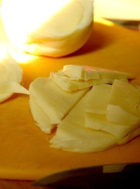 5. Оставшийся сыр нарезать пластинками или натереть на терке, зеленый лук нарезать и посыпать пирог. Убрать в духовку еще на 10мин. Я использовала сыр Сулугуни: прочитала, что он прекрасно плавится и им можно заменить сыр Моцарелла в пицце.