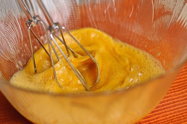 Взбейте яйца, соль и коричневый сахар до светло-коричневого оттенка.