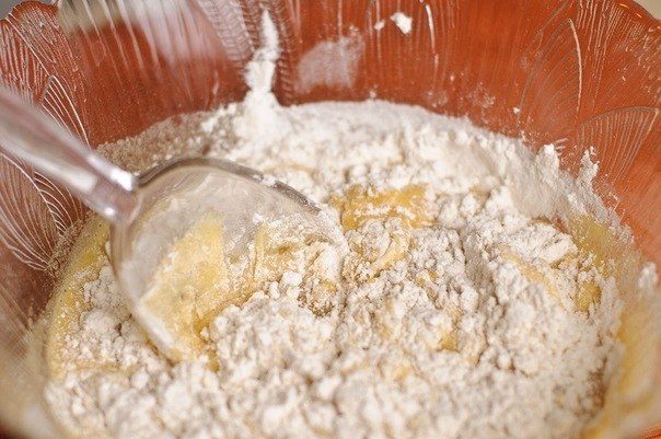 Добавьте растопленное сливочное масло и корицу.Хорошо смешайте. Всыпьте просеянные муку и разрыхлитель и аккуратно перемешайте.