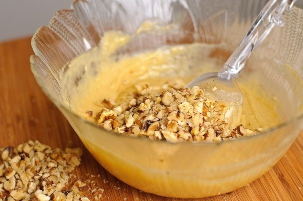 Всыпьте половину измельченных орехов в тесто.