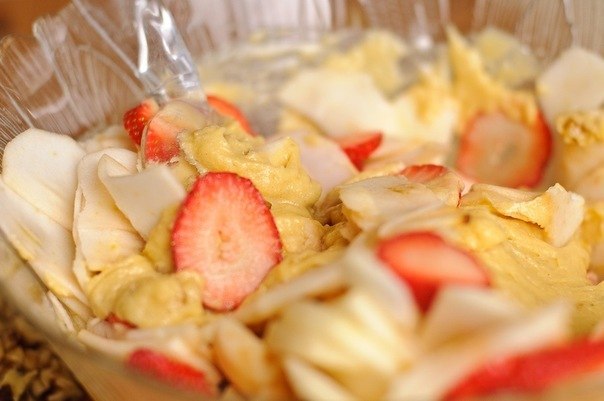 Добавьте нарезанный фрукты. Перемешайте.