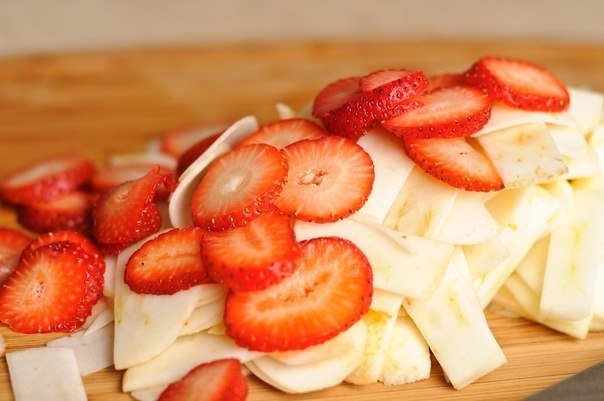 Тонко нарежьте яблоки и клубнику (если используете).