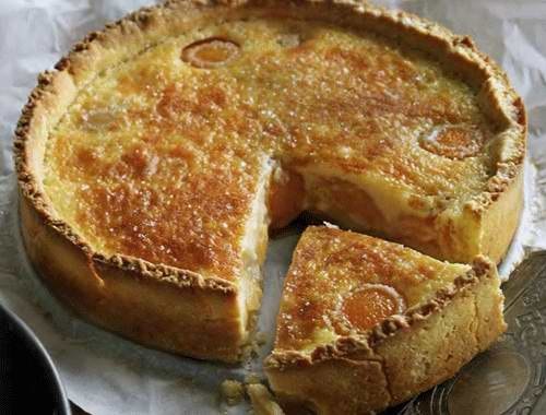 5 Быстро раскатайте тесто и выложите его в форму для пирога, смазанную сливочным маслом, так. чтобы получилось дно с высокими бортиками. Наколите тесто вилкой, выложите на него абрикосы и залейте смесью из блендера.
