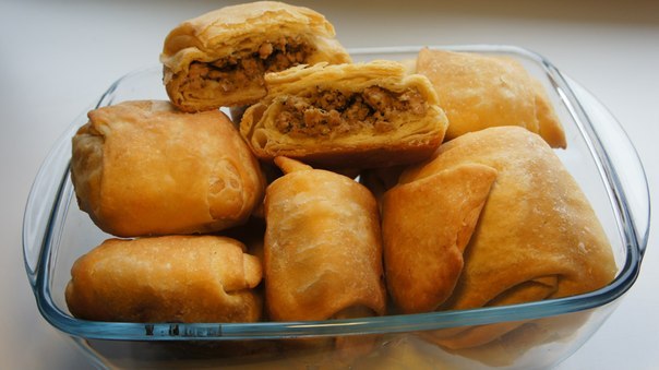 Готовые пирожки выложить на смазанный маслом противень швом вверх. Смазать поверхность пирожков оставшимся маслом. Дать пирожкам отстояться в течении 5-7 минут. Затем немного прижать их ладонью и поставить в духовку на 35-40 минут или до румяной слоистой корочки