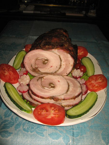 Для рулета используют грудинку и пашину. Мясо снимают с костей одним куском, промывают под проточной струёй воды, укладывают на доску, посыпают с обеих сторон специями и солят, затем сворачивают рулетом и обвязывают пеньковой бечёвкой, затем обжаривают в духовке на противне со всех сторон при температуре 260 градусов до готовности, переворачивая каждые 15 мин. Подают как в холодном, так и в горячем виде. Гарнир: свежие, маринованные, солёные овощи, жареные овощи, рассыпчатые каши. Подают с горчицей, хреном, томатным и соевым соусами.