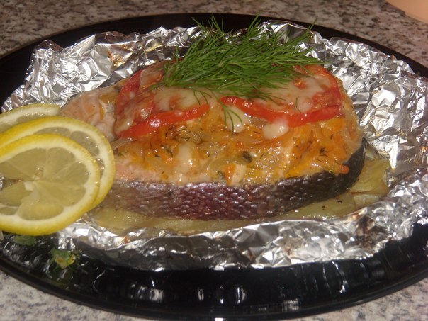 2.Кусочек фольги смазать раст. маслом,уложить кружочки картофеля,затем кусочек рыбы,сверху овощи.