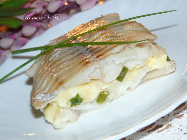 На фольгу ,смазанную маслом, положить один пласт филе и посыпать тёртым сыром. Затем выложить яйца и лук, снова посыпать сыром. Закрыть вторым пластом рыбы. Фольгу закрыть конвертом, выложить на противень. Духовку заранее разогреть. Запечь рыбу в духовке при температуре 250 градусов примерно 20 минут.