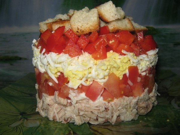 Яйцо варёное натереть на средней тёрке перец сладкий порезать кубиками Сухарики готовятся из трех кусочков белого хлеба. Нарезаем кубиками, сбрызгиваем водой, солим и сушим на сковороде.