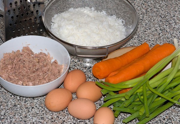 1. Сварите яйца вкрутую. Сварите морковь, очистите и охладите до комнатной температуры. Сварите рис и охладите до комнатной температуры. Выложите рыбные консервы в небольшую миску, уберите кости и кожу, разомните вилкой. Мелко нарежьте зеленый лук.