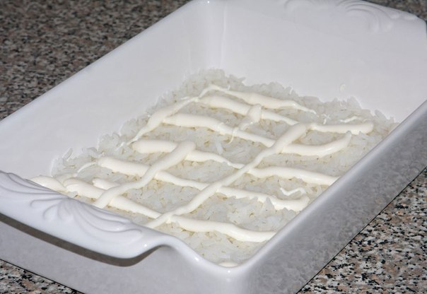 2. Возьмите салатницу с прямыми боковыми стенками (можно взять форму для выпечки) и положите на дно слой риса, толщиной около 3 см. Полейте сверху майонезом.