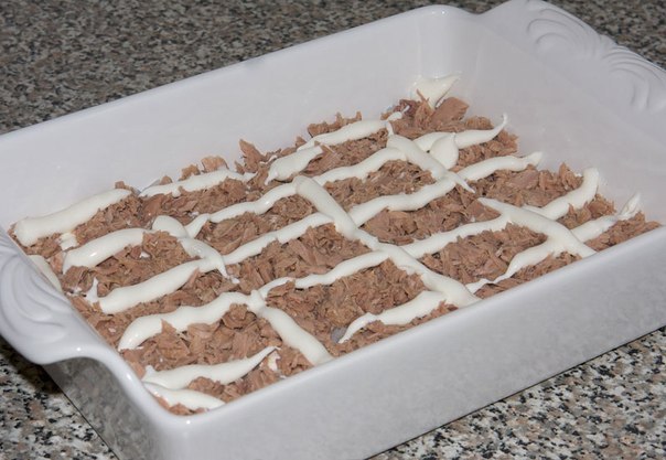 3. Выложите на рис с майонезом слой рыбы и снова намажьте немного майонеза сверху.