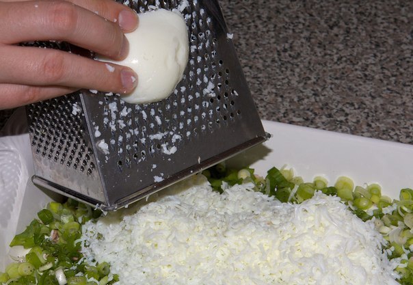 5. Очистите яйца, отделите желтки. Натрите яичные белки на терке и выложите поверх лука. Немного подсолите белки и намажьте майонезом.