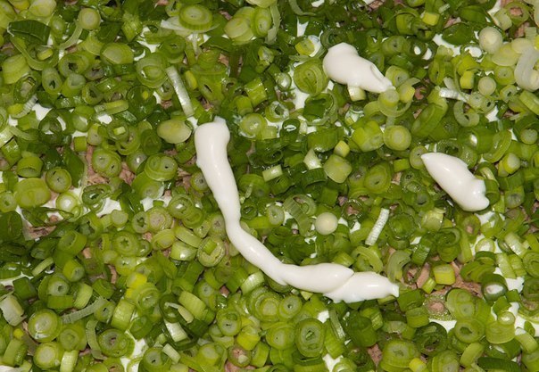 4. Посыпьте рыбу мелко нарезанным зеленым луком, приправьте молотым черным перцем и намажьте сверху немного майонеза.