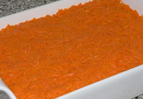 6. Натрите вареную морковь на крупной терке, разложите ее на белки и аккуратно прижмите руками. Покройте морковь тонким слоем майонеза (размажьте его с помощью вилки или лопатки).