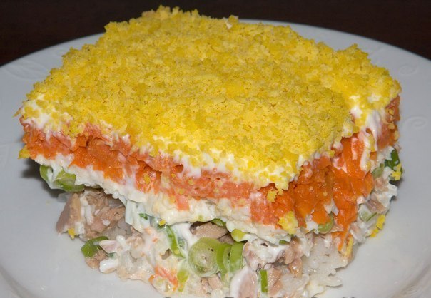 А я не люблю с картошкой,делаю исключительно с рисом и еще на морковку тру кисло-сладкое яблоко.Этот рецепт новогодней мимозы я взяла на заметку в журнале»Лиза»и с тех пор только его и готовлю.