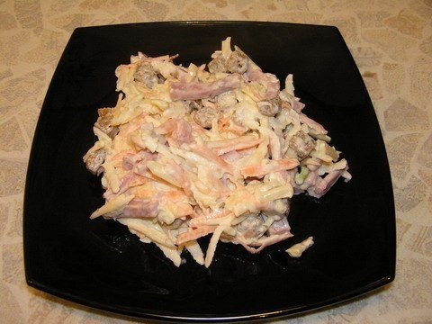 да! супер салат. я не использую сухарики и морковку. но добавляю грецкие орехи. и, думаю, варёную моркови лучше