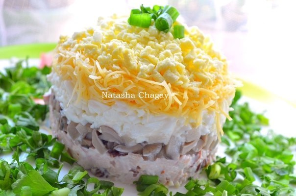 Отделить белки от желтков. По отдельности натереть. Мясо и грибы мелко порезать. Сыр натереть на мелкой терке. Мясо заправить майонезом. Выкладываем слоями снизу вверх: мясо, грибы, майонез, белки, майонез, сыр, майонез. желтки. украсить зеленью..