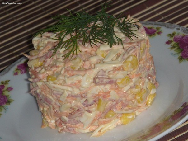 1.Морковь и сыр натереть +колбаса(соломкой)+кукуруза+чеснок и майонез.