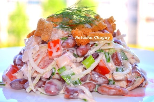 колбаса копченая соломкой, маринованные огурчики, немного чеснока,фасоль консервированная белая — 1 банка, 1 банка красной / лучше ее промыть/, много петрушки, майонез, сухарики добавьте перед подачей на стол ,чтобы не раскисли и лучше ржаные. попробуйте так — тоже вкусно)